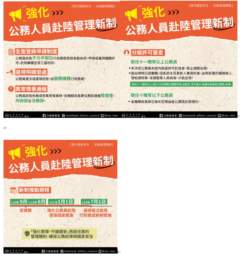 | 四、 | 另為利瞭解赴陸港澳管理機制,陸委會已製作宣傳圖卡及更新該會官網「公務員赴陸專區/Q&A」(https://www.mac.gov.tw/CSGTC/News.aspx?n=CEE979ACE3148043&sms=CF6C48CEFB93A5EE),檢附宣導圖卡1份。 |