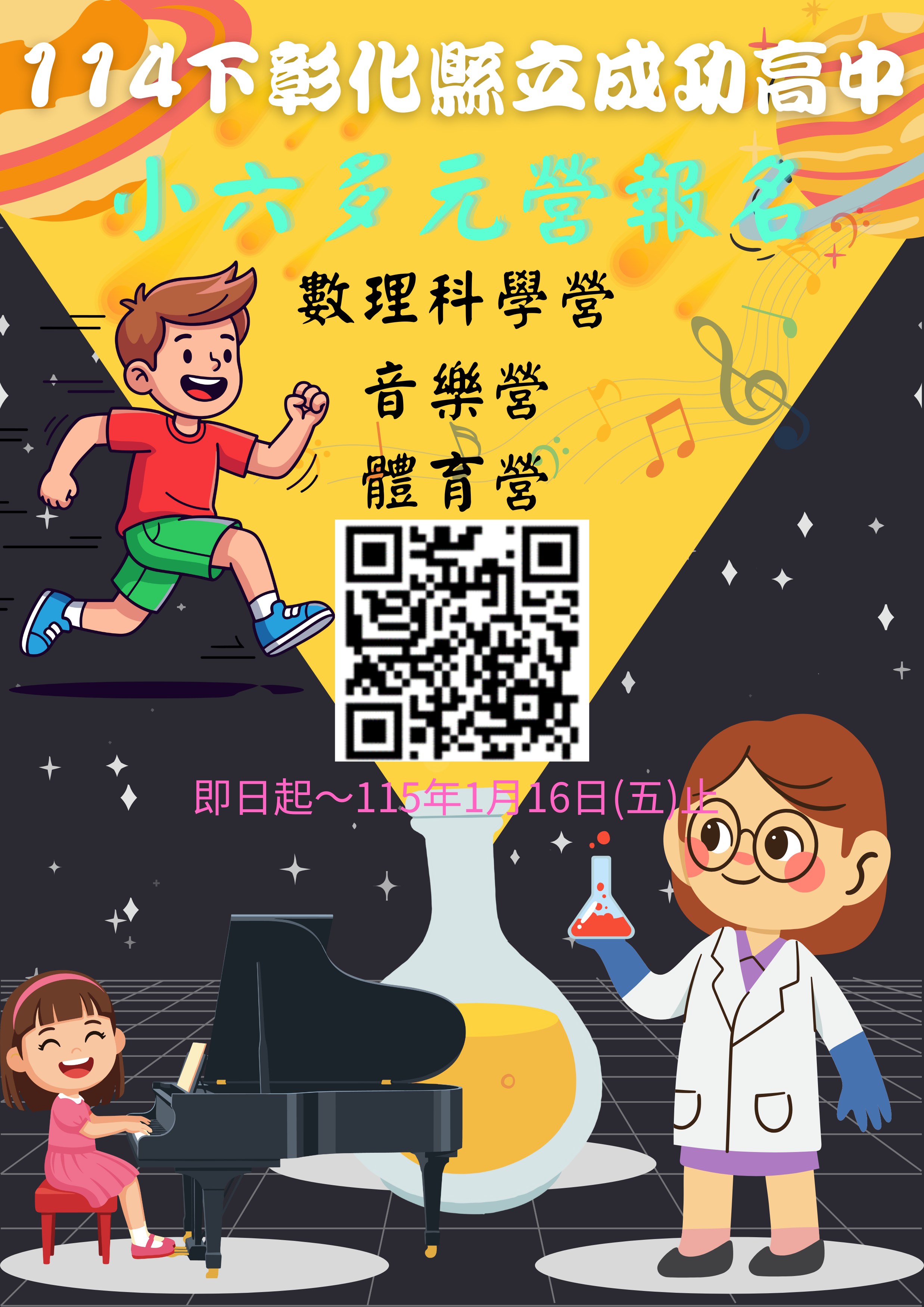 114學年度下學期成功高中小六多元營開始報名了! 課程涵蓋~數理科學、音樂、體育 星期三中午上課,完全免費(書籍沿用) **上學期有來上課的同學,下學期還是要再報名一次** 報名連結: https://forms.gle/VdYSRWKbYeRAGsnd6