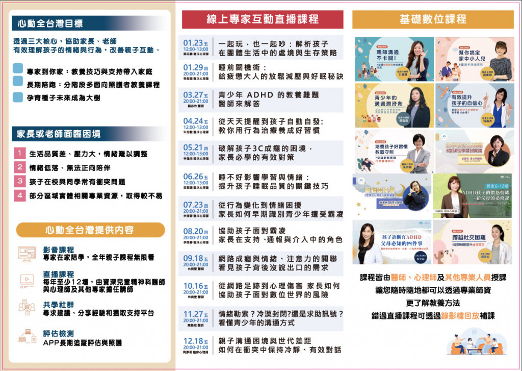 | 二、 | 課程由兒童心智科醫師、臨床心理師、職能治療師等專家群共同規劃數位影音課程、專家直播課程等,詳如附件。 |