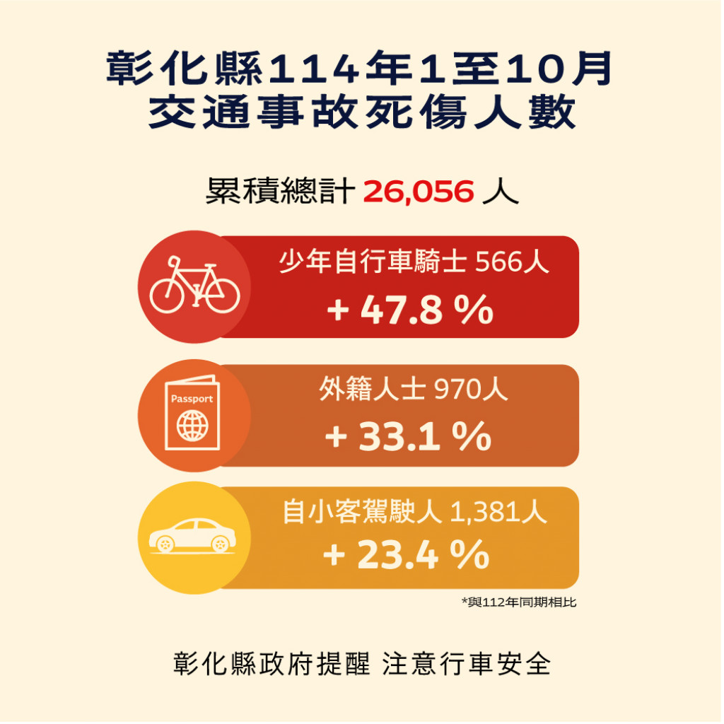 【轉知】本縣114年1-10月道路交通事故死傷累計26,056人