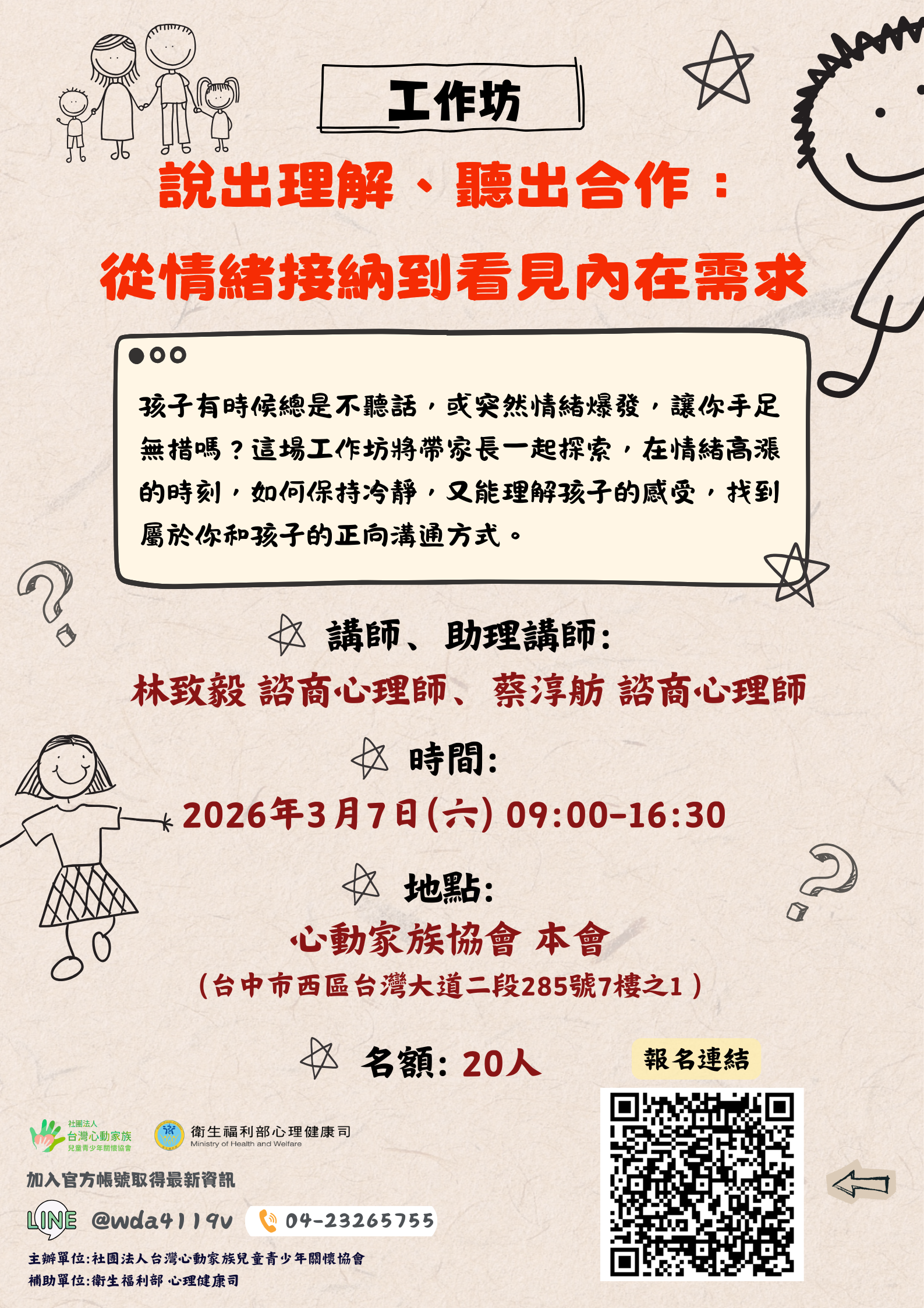 活動資訊如附件(或詳見海報 QR Code),誠摯邀請各校教師、輔導人員及對議題有興趣之家長踴躍報名參加。