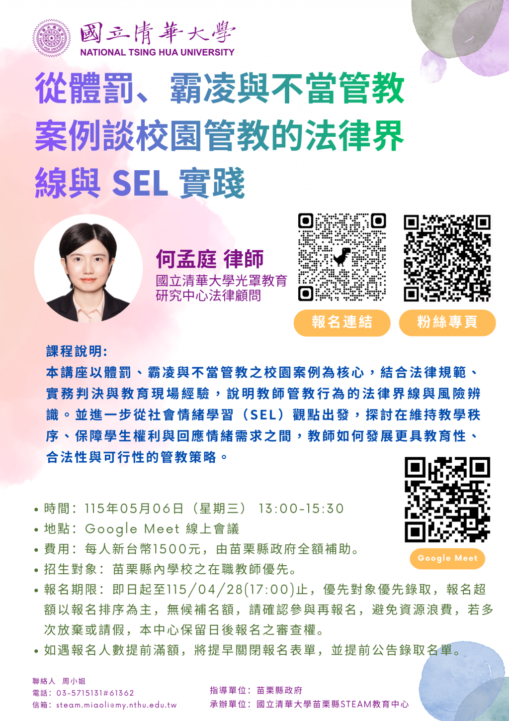 【轉知】國立清華大學STEAM教育中心辦理「從體罰、霸凌與不當管教案例談校園管教的法律界線與SEL實踐」主題課程,鼓勵教師踴躍參與。